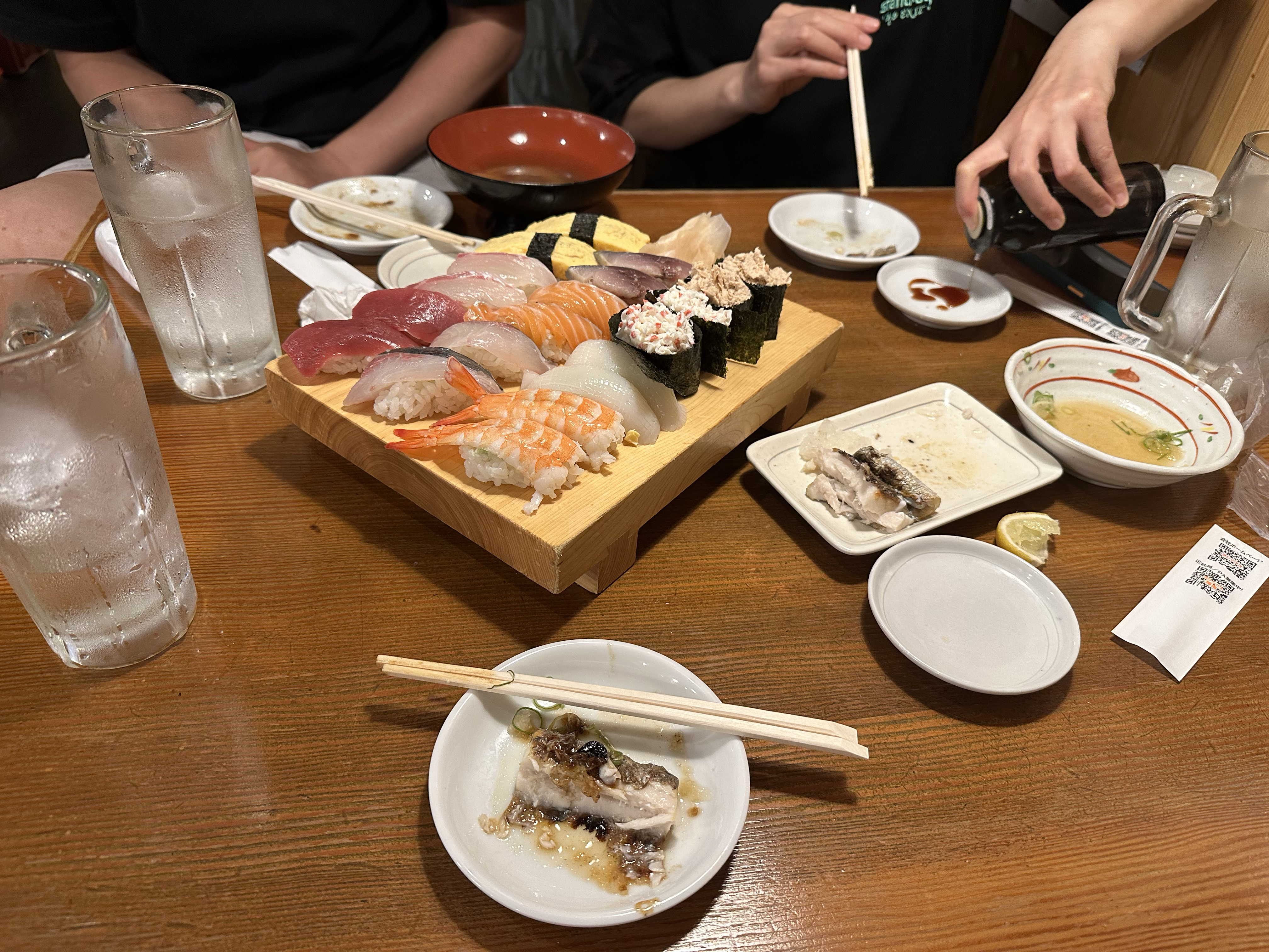 大阪。坐电车闲逛一圈之后到阪神的大楼里边找爸妈吃晚饭,商场里已经不剩下什么店还开着,负一楼更是直接关掉,在电梯那儿看了半天才反应过来应该是打烊了。于是我们直接返回奈良,在回酒店的路上找了个居酒屋。那晚弥补了我上一次来日本缺点一吃寿司都没有吃的遗憾,且几乎吃的是最好的一顿。身边是吵吵闹闹的下班族。