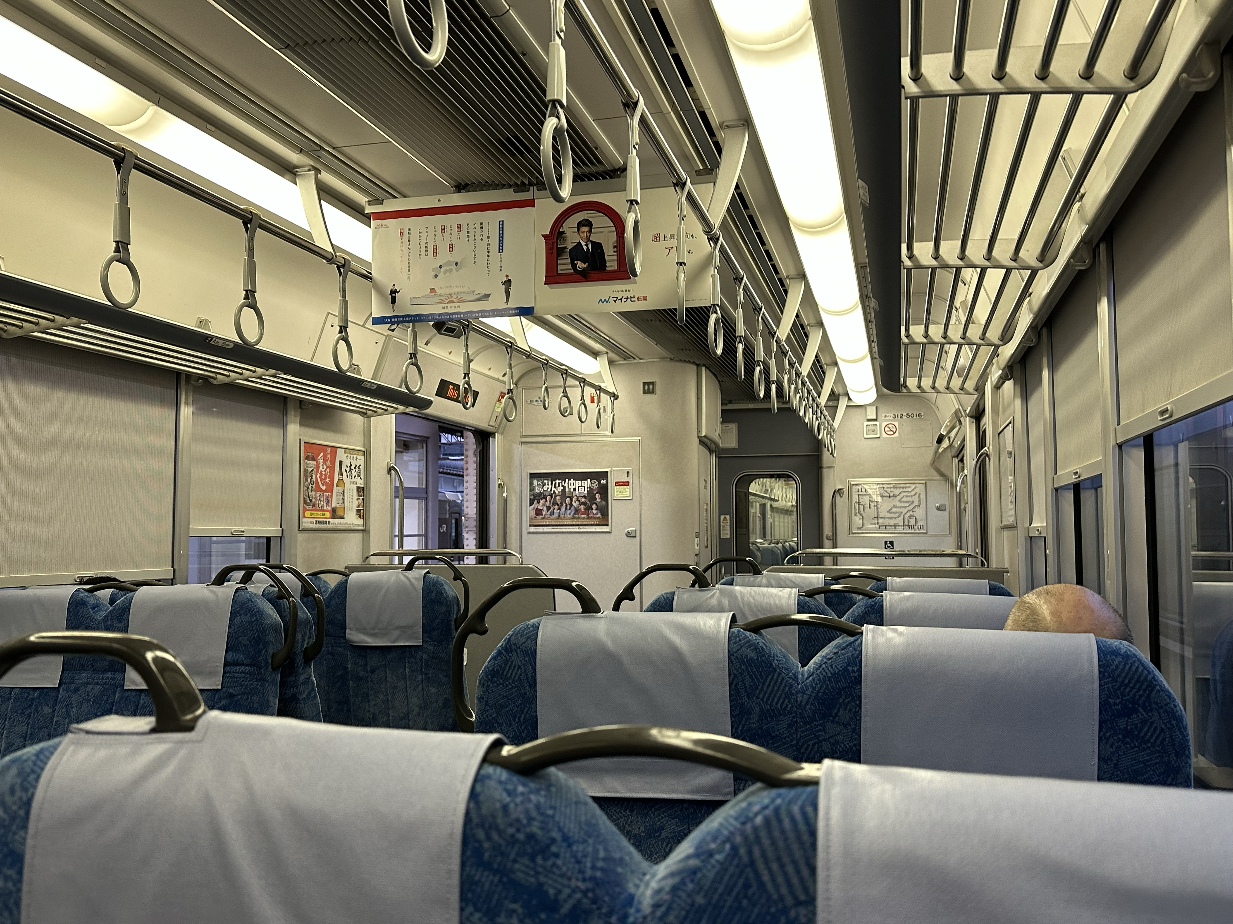 琵琶湖线。好不容易弄到座位的我们把行李放到过道上尽量不影响别人的地方,却失望地发现窗帘是拉下来的。我旁边坐着的女人在仰着头睡觉,嘴巴都张开了。等到她醒了,我妈向她招招手,笑着问她介不介意把窗帘拉上去。我们于是终于看清了窗外滋贺的乡野景色。