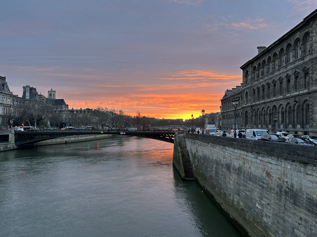在经过一个路口后,我的余光瞥见左手边的日光。那里是日出。我也顾不上拍照了,迅速地往桥上跑去。我现在只能靠照片补充那天记忆里的色彩,而在现场看是相当震撼的,以至于许多晨跑的路人也举起手机来拍照。在塞纳河边走着,我的步子明显放慢了。我什么也不想了。河对岸巴黎的建筑静静地坐落着,面前是印象般的日出:这一切真的已经在另一个世界发生了。
