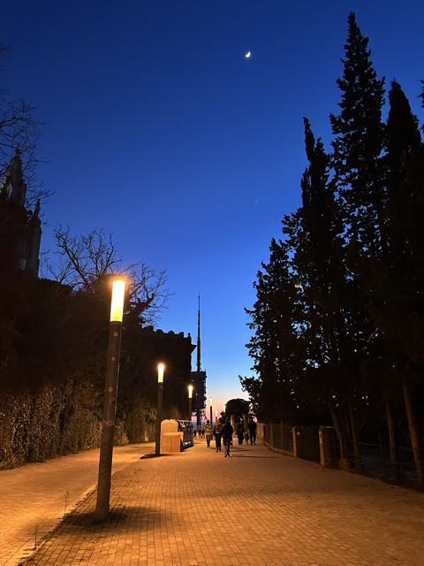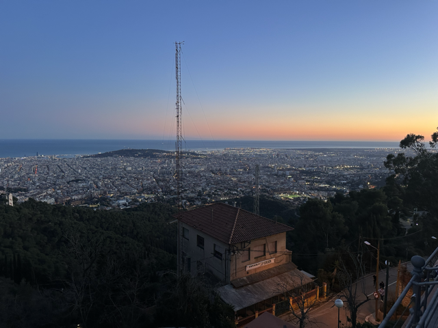 上提比达博山的野路无疑非常艰辛。我们看到许多骑自行车往下快速滑行的人,非常好奇他们是怎么上去的。我们还遇到了许多小跑下来的人,许多甚至穿得非常轻薄。当然还有刚开始登山时身后的白人老太太,还有随后身前的韩国情侣。当我弯弯绕绕爬了四十分钟那种几乎不能称之为路的野路时,我渐渐发现太阳正在无可避免地下沉。而当我终于到达山顶,它已经完全消失,残留下来很远的海面上的一抹简单的粉红色。