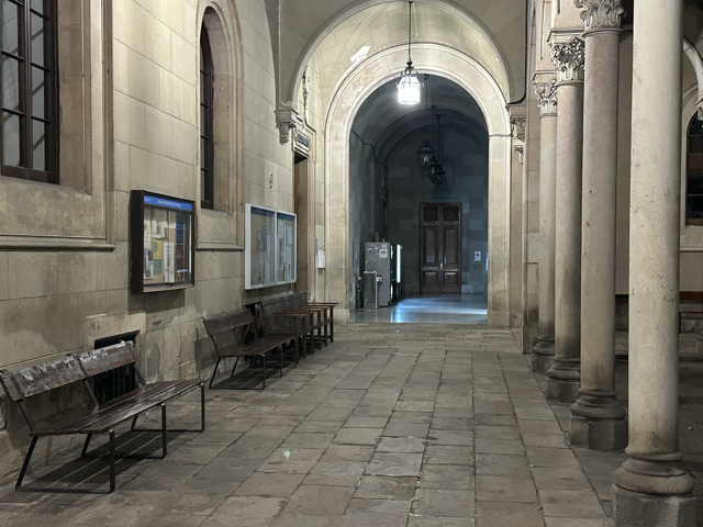 于是我就和他溜了进去。我们在走廊里聊了很久,久到我开始担心我能不能赶上末班车。“没事,还有车。”我查完之后和他说。他想带我从另外一个门出去,于是在那个大厅的出口用加泰语和工作人员询问,结果是出不去。于是我们又从溜进来的小门溜出去。后面一天,当我又站在大学的街对面,我看到那小门已经关上了。